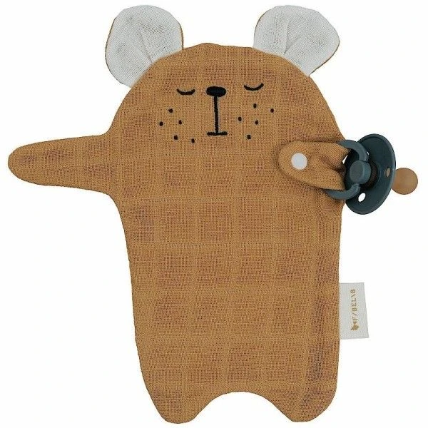 Pour les petits bébés écolo, et dès la naissance, Eveil, douceur et réconfort en compagnie de ce Doudou attache-sucette Ours Ocre Fabelab® Coton Bio GOTS de couleur ocre. Un petit doudou attache sucette qui permet de garder la précieuse sucette au plus près de bébé. Un doudou en Lange de coton bio, un mignon petit ours tient la tétine de votre tout-petit et s’assurera qu’il se sente en sécurité. Au besoin, détachez la tétine du bras de l’ours et laissez le bébé jouer et se câliner avec l’ours tout doux. Un doudou pour les bébés dès le premier age, avec une jolie bouille sympathique, simple, douce et tendre dont les traits d’expression assez neutre, lui confère cette identité unique. Facile à saisir, à câliner grâce à ses appendices variés (oreilles, bras, jambes), notre Doudou ours, saura prendre soin de bébé, et lui apporter douceur et réconfort.
