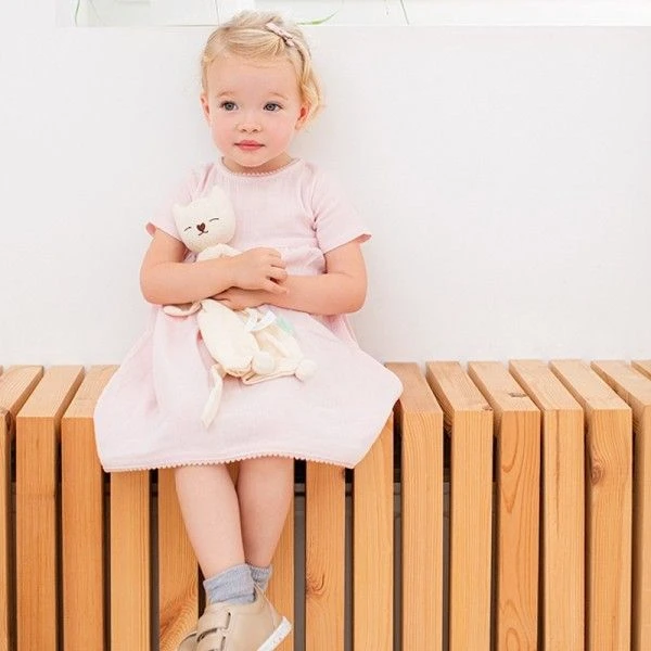 Pour les bébés bio, et dès la naissance, Découverte, confort & réconfort en compagnie de ce Doudou Plat bébé Hoppa® Chat Mila Lange Mousseline Écru 24cm Coton Bio GOTS. Un petit chat doudou amusant doté de 2 oreilles à mâchouiller , une jolie tête ronde fourrée de fibre de maïs, un long corps de mousseline rose cerise pour des sensations variées. Un vrai doudou bio pour accompagner et réconforter bébé dans ses premiers moments d’inquiétudes et ses bonheurs. Facile à saisir grâce à sa faible épaisseur, son large corps et ses différents petits appendices (des grandes oreilles à secrets, des petits bouts de pattes tout ronds, faciles à mâchouiller pour apaiser les douleurs dentaires,…) ce doudou Mila en coton bio sera de tous les câlins. Un amusant compagnon qui prendra l’humeur de bébé, et l’accompagnera pour bien débuter dans la vie. Un doudou bébé Hoppa® issu du commerce équitable (certification IFAT: International Fédération for Fair-Trade), et conçu à partir de coton bio (organic c’est à dire, issu de l’agriculture biologique) et de fibre de maïs vierge Bio. Les doudous Hoppa® sont certifiés GOTS, certifiant que tous le processus (de la culture du coton, la production de fibre de maïs, les tricotages, colorations, confections du tissu,….) sont bien biologique (100%). Avec ce doudou, bébé devient défenseur de la nature, de notre environnement, et du travail des hommes….et n’a peur de rien.