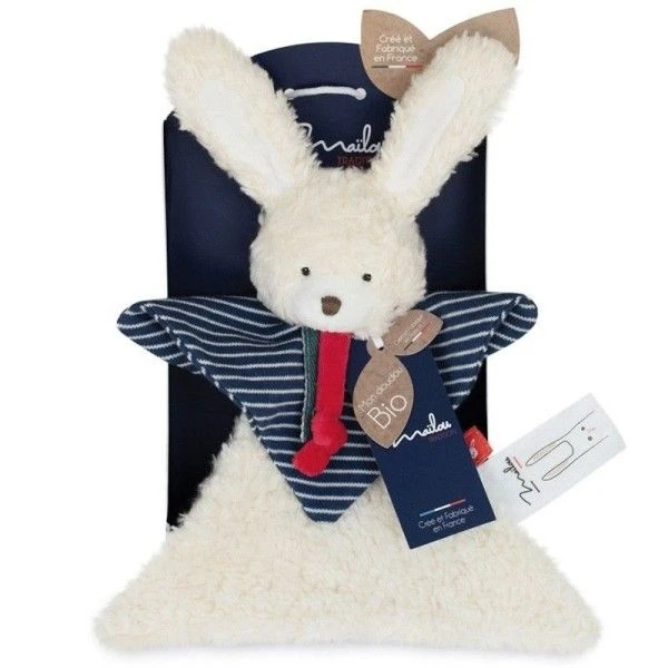 Pour les bébés bio dès la naissance, éveil émotionnel et câlins éclatants de tendresse et de bonne humeur avec ce joli doudou plat en coton Doudou plat Lapin 22 cm Maïlou Tradition® coton bio. Une doudou plat en forme de lapin aux belles couleurs naturelles et au poncho marin. Les petites yeux noirs du lapin sont là pour rassurer bébé. Un nœud rouge, pour chatouiller le nez pour se réconforter et pour dégourdir les petits doigts. Un doudou rigolo fait en France, 100% Breizh et en coton bio certifié GOTS, pour un enfant unique en quête de découvrir et d’évoluer dans un monde durable !