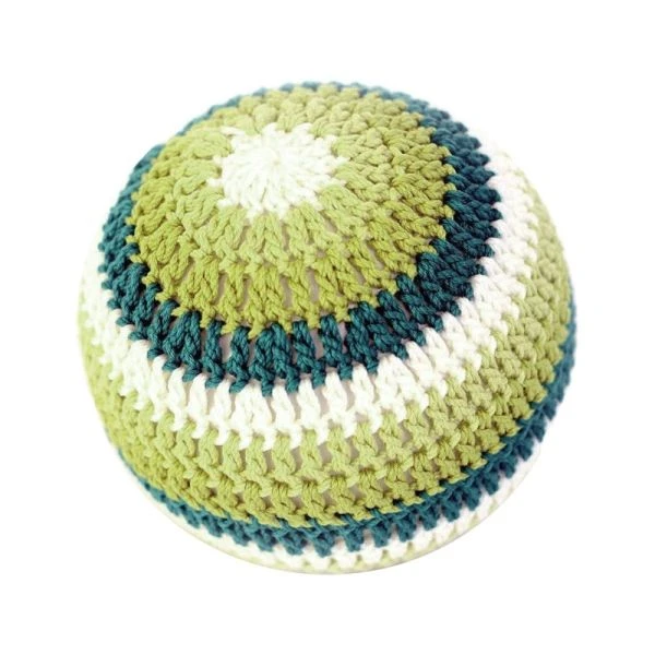 En plus de sa fonction ludique, notre balle hochet participe au bon développement de bébé. Dans un premier temps, elle stimule sa vision en l’entraînant à suivre du regard un objet. Plus tard, l’enfant exercera sa motricité . Tout d’abord, bébé se retournera puis rampera et enfin marchera pour la faire rouler. C’est un jouet évolutif. De cette manière il développe la préhension et la coordination œil-main. Son ouïe est également sollicitée. Le bébé peut l’attraper et le secouer, il entendra le son du grelot. En passant la balle d’une main à l’autre bébé fait travailler ses deux hémisphères cérébraux. Cette balle hochet en crochet est fait main de manière artisanale avec le plus grand soin. Cela la rend unique et spécial.