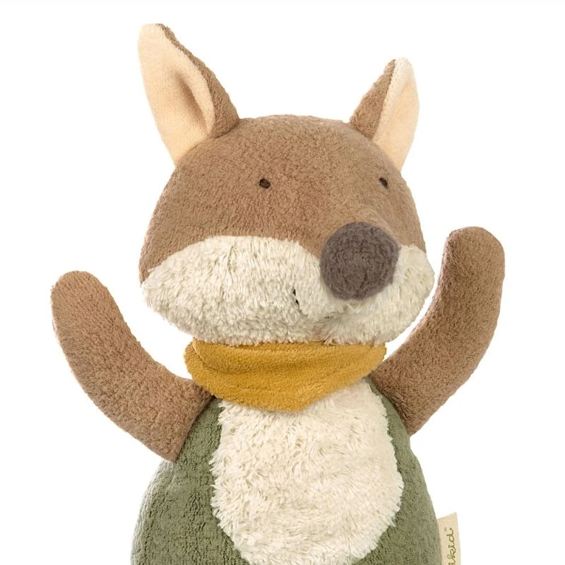 Pour les bébés bio & écolo, et dès la naissance, Eveil, confort & réconfort en compagnie de cette jolie Peluche musicale Bio Renard 26 cm Green Sigikid®. Une belle peluche doudou musicale en forme de renard sympathique pour réconforter et endormir bébé. Avec son long ventre écru tout doux, ses longues pattes, et son petit foulard couleur curry, notre Doudou boîte à musique renard écolo green, ne demande que des câlins, et recevoir plein de bisous sur sa bouille toute ronde. Dans son ventre, la boîte à musique facile à lancer avec la tirette et son anneau de dentition, apportera à bébé des sons doux et mélodieux de compositeurs prestigieux (Brahms, Mozart etc..). Avec ses petits yeux noirs, son large sourire et son corps en coton tout doux… et ses longues pattes avant pour mieux le tenir et le mâchouiller tendrement, ce renard ne quittera plus bébé. Protecteur de la nature et défenseur du développement durable, bébé le revendique avec ce joli doudou renard, amusant, protecteur, Chic & écolo. Les boucles de velours de coton bio à la texture douce de notre peluche musicale renard, offrent des sensations tactiles, auditives et visuelles inoubliables. En compagnie de cette peluche musicale bio en coton, rempli de Laine naturelle et de coton, bébé est prêt à affronter le monde, en douceur, en couleur et en sécurité: Le doudou est en coton, un Coton Bio issu de l’agriculture Biologique (Kba : Agriculture Biologique Contrôlée)et rembourré en laine.