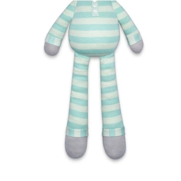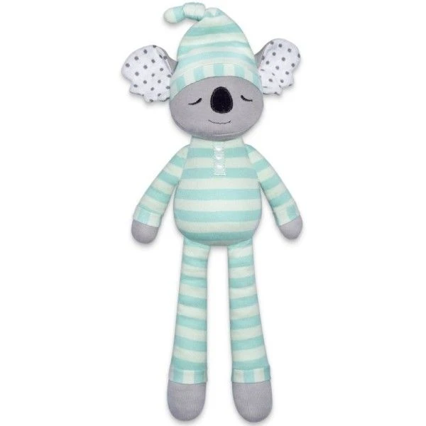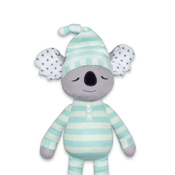 Pour les bébés bio, et dès la naissance, Eveil Physique, Jeux & réconfort avec cette Peluche Bio « Peluche Organic Farm Buddies™ Koala Kozy 35cm Coton Bio ». Une peluche doudou de 35 cm de hauteur, en jersey de coton bio rayé Vert d’Eau et écru pour le corps et d’un gris souris pour les pattes et le museau, habillé d’un joli pyjama rayé, pour faire de jolie sieste dans les arbres. Et bien sûr la sympathique bouille endormie de notre ami koala est là pour rassurer bébé,… Avec ses longues pattes pour la saisir, ses grandes oreilles à secrets, notre Koala fera craquer plus d’un bébé. Avec cette peluche doudou Organic Farm Buddies™ de la marque Californienne Farm Buddies™, Bébé pourra se dégourdir les doigts, mâchouiller, découvrir les couleurs, les formes, et les câlins. La tête de la peluche contient comme les hochets et le doudou plat carré assorti… un petit grelot discret.
