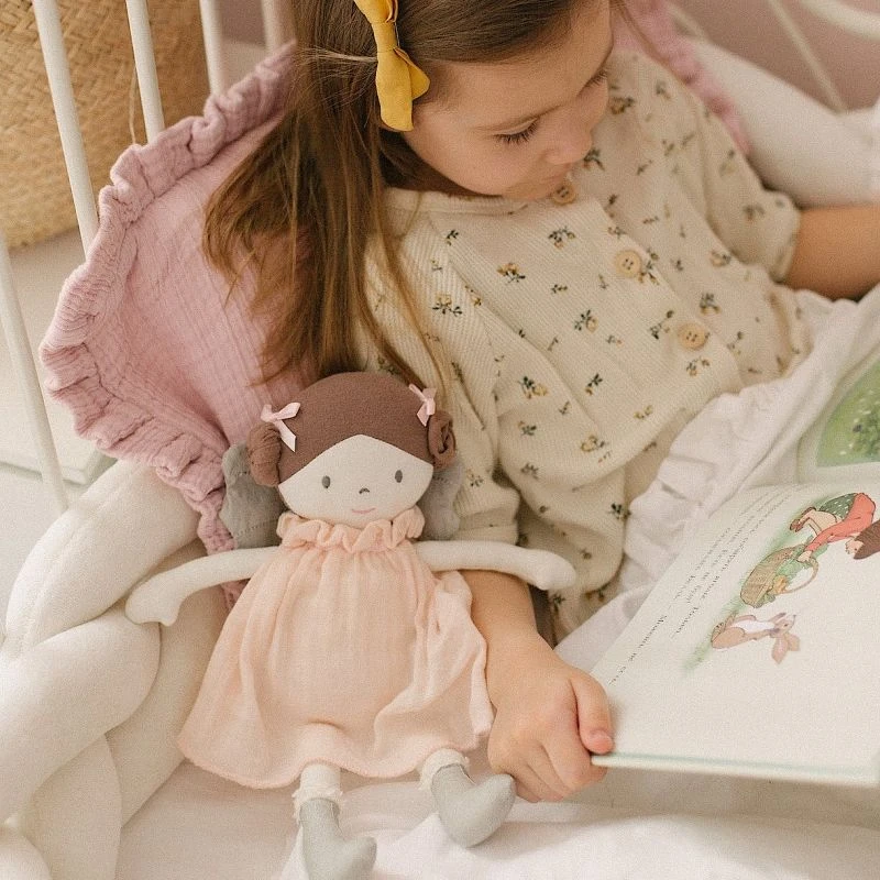 La poupée chiffon Angelina est l’un des derniers ajouts à la collection de poupées Bonikka. C’est une poupée très douce et adorable fabriquée à partir de tissu biologique. Sa belle robe bio rose est complétée par des ailes argentées scintillantes et des bottes assorties qui font d’elle la poupée de fée parfaite! Une poupée chiffon prête pour beaucoup de câlins.