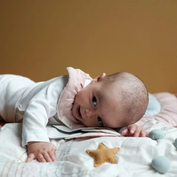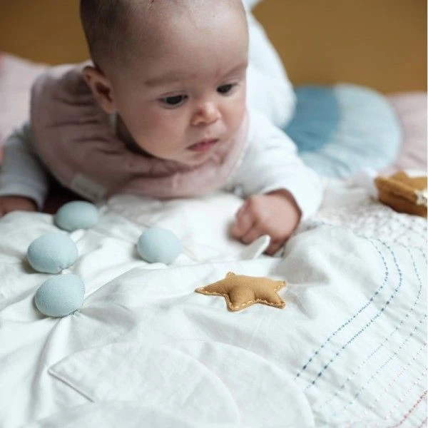 Dés les premiers mois et avant de se tenir assis, les bébés adorent s’allonger confortablement et jouer au hochet, … ou sous une arche d’éveil, afin d’en explorer les détails surprenant. Par magie et un peu aidés par la gravité, nos petits explorateurs vont rapidement se retrouver à plat ventre et ainsi en position de se déplacer (enfin ramper) et de découvrir le monde. Un tapis bien décoré va certainement motiver ce mouvement, roulement sur le côté, clé de la liberté…. Alors à plat ventre, tenir sa tête va devenir bien vite très fatiguant, d’ou la nécessité de pouvoir la poser sur un beau tapis, doux, confortable et surtout en coton bio ou matière naturel.